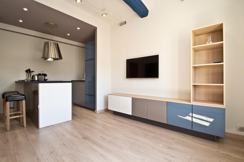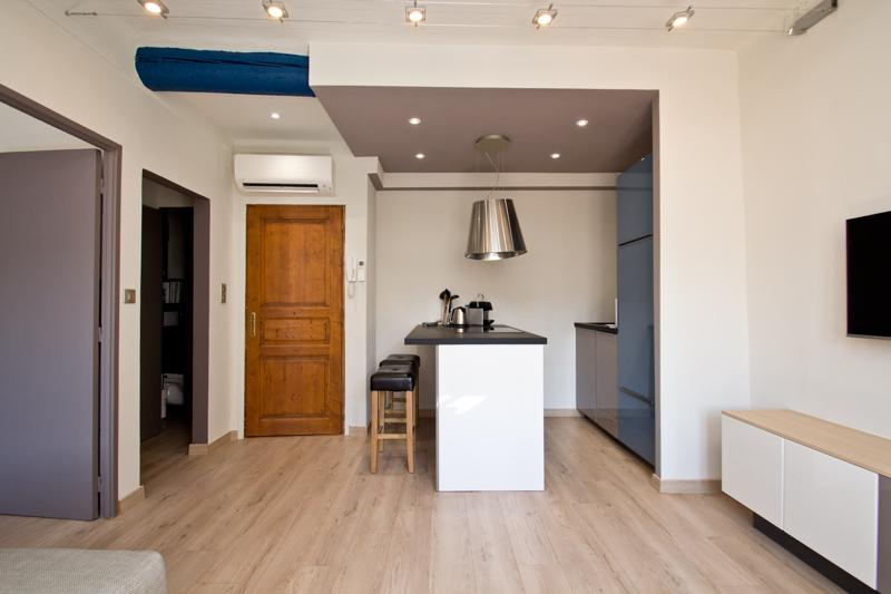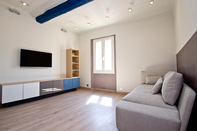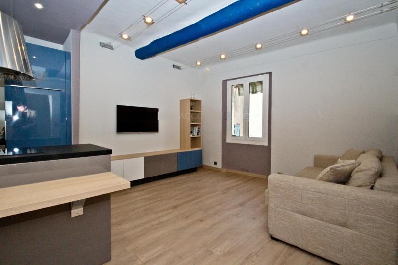 Located on rue du Commandant André, a charming street lined with boutiques and restaurants, this one-bedroom apartment sits in the very heart of Cannes on the 3rd floor of a building without lift. Fully renovated in a resolutely modern style, the apartment offers a bright and neatly arranged living room enhanced by grey and blue glossy storage units. The bedroom, decorated in the same colour palette, features a double bed, while the Zen-style bathroom includes a pleasant shower with separate toilets. A fully equipped kitchen opening onto the living room completes this stylish and centrally located apartment, ideal for enjoying Cannes on foot.